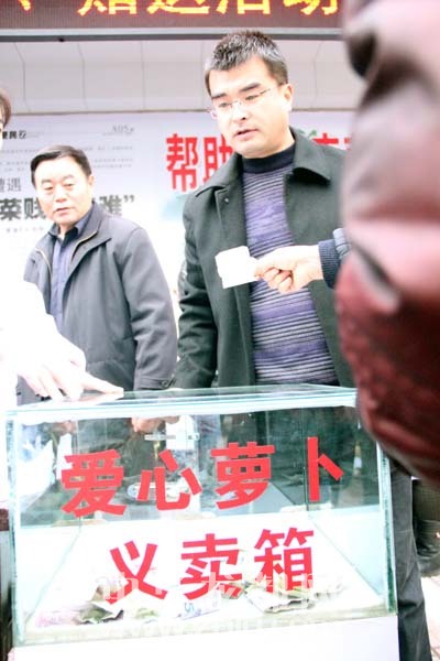 ????經(jīng)過(guò)商量,本報(bào)決定聯(lián)合同和堂大藥店開(kāi)展“愛(ài)心蘿卜”義賣、贈(zèng)送活動(dòng)。在川匯區(qū)七一中路與工農(nóng)路交叉口處的同和堂大藥店門(mén)前設(shè)立愛(ài)心捐款箱,市民只要獻(xiàn)出自己的一份愛(ài)心,“愛(ài)心蘿卜”隨便拿;設(shè)立愛(ài)心蘿卜購(gòu)買聯(lián)絡(luò)點(diǎn),如社會(huì)團(tuán)體、個(gè)人需要購(gòu)買蘿卜,只需將“愛(ài)心蘿卜款”投進(jìn)愛(ài)心捐款箱,所有愛(ài)心捐款歸農(nóng)民;憑購(gòu)藥小票,市民就可領(lǐng)取一份“愛(ài)心蘿卜”。