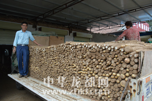 ??? 槐山藥經(jīng)紀人李勝利在自己的貨車上查看槐山藥裝車情況,據(jù)他介紹,他每年要向外地銷售近5000噸槐山藥。