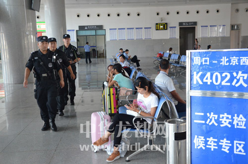 ????9月1日9時(shí)許,周口晚報(bào)記者在周口市火車站候車大廳,看到3名特警隊(duì)員正在執(zhí)勤。他們著裝統(tǒng)一,邁著整齊的步伐穿行于乘客之間。