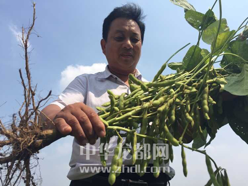 ??? 圖③ 9月25日,在西華縣逍遙鎮(zhèn)全國(guó)種糧大戶曹自堂的試驗(yàn)基地,曹自堂看著試種的大豆新品種喜出望外。記者 張猛 攝