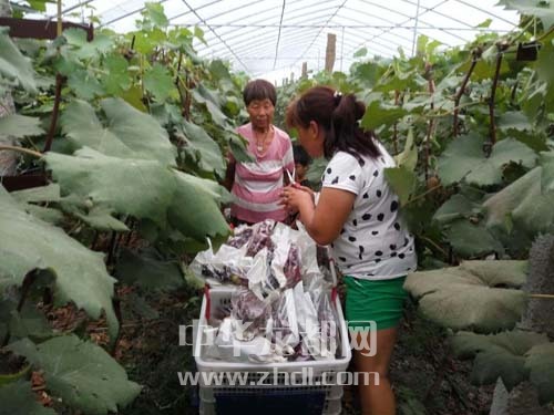 ????在農(nóng)場的葡萄大棚里,一串串葡萄被套上了塑料袋,形成了五顏六色的奇特景觀,社員正忙著采摘裝箱(如圖)。農(nóng)場技術(shù)人員介紹:“給葡萄套袋,可以明顯改善果實(shí)品質(zhì),保護(hù)果實(shí)不受病蟲害侵襲,減少農(nóng)藥殘留,防鳥啄食,改善果實(shí)外觀,提高果品檔次,是當(dāng)前生產(chǎn)高品質(zhì)、無公害葡萄的有效措施?!?/p>