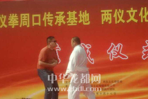 ????當(dāng)日,在兩儀拳周口傳承基地揭牌和兩儀文化周口發(fā)展中心落成儀式上,兩儀拳傳承人分別做了兩儀拳展示和兩儀養(yǎng)生功夫表演。隨后,段保華的弟子高躍鑫請(qǐng)現(xiàn)場(chǎng)觀眾上臺(tái)體驗(yàn)兩儀拳點(diǎn)穴。一位身材高大、體重近100公斤的彪形大漢應(yīng)聲上臺(tái)。彪形大漢與高躍鑫交流后,表示已準(zhǔn)備完畢。話音剛落,彪形大漢就被點(diǎn)中穴道,立即倒地。讓人驚奇的是,解穴后,彪形大漢隨即恢復(fù)正常。“以前聽說過兩儀拳的威力很大,沒想到會(huì)這么大?!北胄未鬂h說。