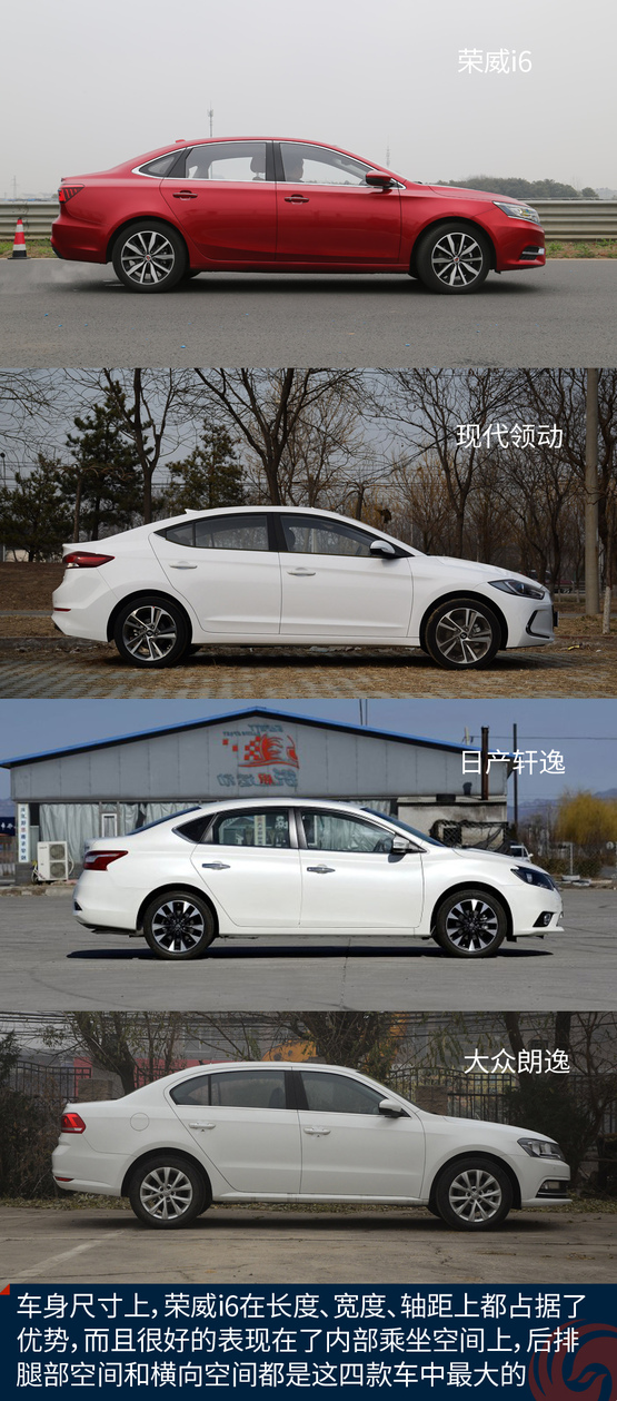 從上面的表格可以看出,榮威i6的長寬高分別為4671*1835*1460mm,在寬度和長度上,都要優(yōu)于其他三款車。特別是車寬,達(dá)到了1835mm,橫向的寬度不僅可以提升視覺效果,對(duì)車內(nèi)橫向空間也影響很大,尤其是后排乘坐3人的時(shí)候。在軸距上,榮威i6以2715mm的數(shù)據(jù)表現(xiàn),穩(wěn)居第一位。