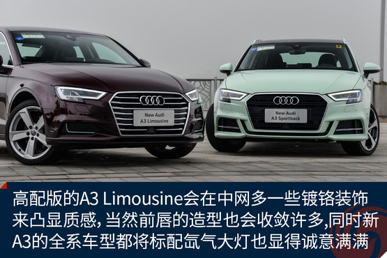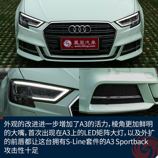 新顏色的加入讓原本青春靚麗的A3變得更加鮮嫩,雖說(shuō)這樣的顏色不一定適合所有人,但是至少我是很喜歡的,應(yīng)該不少女生也會(huì)心生好感。而外觀的改進(jìn)進(jìn)一步增加了A3的活力,棱角更加鮮明的大嘴,首次出現(xiàn)在A3上的LED矩陣大燈,以及外擴(kuò)的前唇都讓這臺(tái)擁有S-Line套件的A3 Sportback攻擊性十足,同時(shí)全系都將標(biāo)配氙氣大燈也是誠(chéng)意滿滿。而高配置的A3 Limousine會(huì)在中網(wǎng)多一些鍍鉻裝飾來(lái)凸顯質(zhì)感,當(dāng)然前唇的造型也會(huì)收斂許多。
