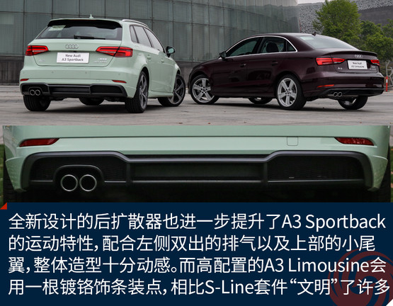 全新設(shè)計(jì)的后擴(kuò)散器也進(jìn)一步提升了A3 Sportback的運(yùn)動(dòng)特性,配合左側(cè)雙出的排氣以及上部的小尾翼,整體造型十分動(dòng)感。而高配置的A3 Limousine會(huì)用一根鍍鉻飾條裝點(diǎn),相比S-Line套件“文明”了許多。與LED矩陣大燈相呼應(yīng)的是全LED尾燈,兩者相輔相成為新車(chē)帶來(lái)了更強(qiáng)的攻擊性以及橫向視覺(jué)延展性,新加入的流動(dòng)式轉(zhuǎn)向燈在美觀的同時(shí)也提升了整車(chē)的科技感。