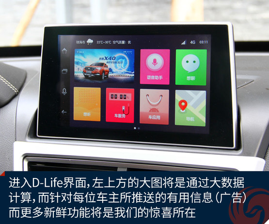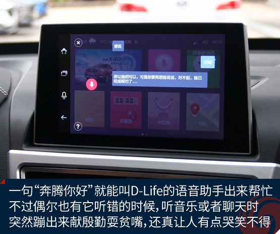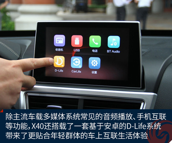 不過跟奔騰X40接觸兩天之后,會發(fā)現(xiàn)它大可不必在對手林立的市場中血拼顏值,靠實力不俗的獨門絕技一樣能夠輕松獲得一席之地。既然面向年輕用戶,豐富的車載娛樂系統(tǒng)很關(guān)鍵。大屏幕、手機(jī)互聯(lián)等等似乎已經(jīng)是這類車的標(biāo)配。奔騰X40更進(jìn)一步,所搭載的D-Life系統(tǒng)讓我們看到了它引領(lǐng)潮流的勁頭。