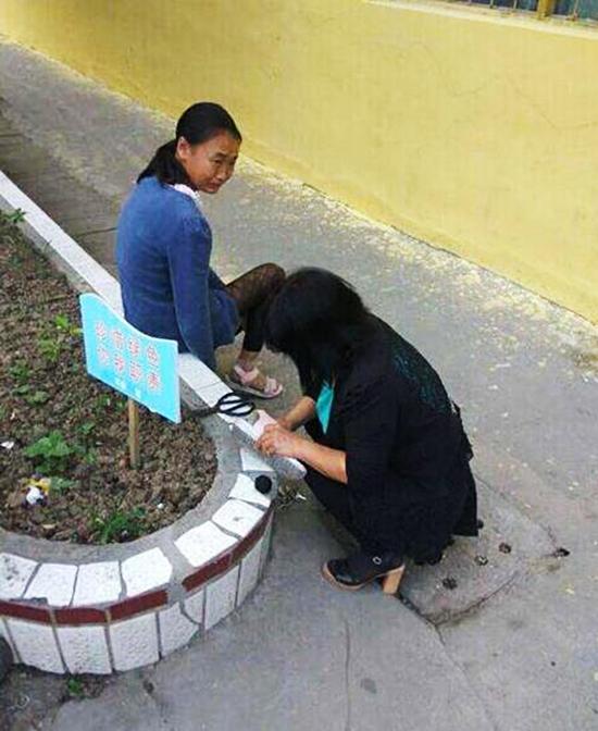 ????近兩天,微信朋友圈流傳一組照片:一位身著黑衣的女子蹲在花壇邊,低頭縫補一只粉色涼鞋(如圖)。旁邊坐著一個小女孩,背過身去拭淚。圖片配文:補鞋的老師像媽媽。這感人一幕發(fā)生在5月21日項城市昌福學校,該校學生大部分是留守兒童,補鞋的女子是該校的郭雪梅老師。這件事經(jīng)河南日報客戶端和河南日報官方微博發(fā)布后,在網(wǎng)上引起強烈反響,很多網(wǎng)友表示,這組圖片戳中了心中最柔軟的那一塊。