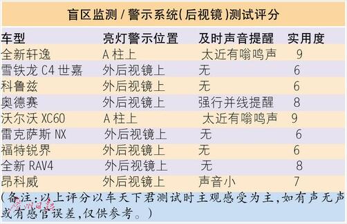 測試車型當中,同樣不會吵的,還有雪鐵龍C4世嘉、福特銳界、雷克薩斯NX等車型,對盲區(qū)內的車輛感應非常靈敏,當我們駕駛車輛將要變換車道,而側后方雷達同時感應到有車輛進入后視鏡盲點區(qū)域時,外后視鏡上的指示燈就會閃爍,提醒駕駛者注意后車。