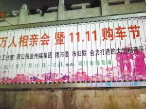 ????據(jù)了解,周口萬人相親會是由市委組織部青年工作辦公室、共青團周口市委、市婦聯(lián)、周口報業(yè)傳媒集團聯(lián)合主辦的大型相親平臺。為再一次給廣大消費者搭建更好的選車、購車平臺,周口報業(yè)傳媒集團決定于11月10日至12日在市體育場隆重舉辦2017周口萬人相親會暨“雙十一”購車節(jié)。