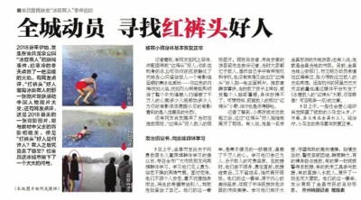 1月3日,中央電視臺新聞頻道《新聞直播間》欄目報道此事。一時間,“紅褲頭”救人的事跡,在金昌市乃至整個甘肅省引起了強烈的反響。在官方微信平臺上,有上百條留言,大多是為“紅褲頭”小哥點贊的。不少人希望找到這個不愿留名的英雄。為此,《金昌日報》以及當?shù)孛襟w紛紛發(fā)起“尋找紅褲頭好人”“尋找冰窟救人的無名英雄”的尋人啟事。