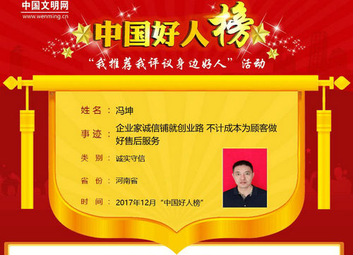 馮坤,男,中共黨員,1974年8月生,河南省周口市太康縣張集鎮(zhèn)人,就職于河南省四通鍋爐有限公司?!按艘姓\意,做事要講誠信,做事要先把人做好?!笔邱T坤創(chuàng)業(yè)成功的秘訣,就是誠信。