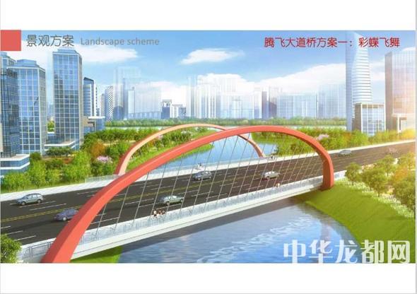 騰飛大道橋的設(shè)計(jì)方案有兩套,分別為“彩蝶飛舞”和“雙鳳呈祥”。“彩蝶飛舞”為下承式鋼管拱橋,寬36米。記者從效果圖中看到,橋兩側(cè)的拱圈,極具色彩感,給人一種賞心悅目的感覺?!半p鳳呈祥”為裝飾鋼管拱橋,寬36米。該橋采用“雙鳳”造型,象征天下太平,富含吉祥之意。