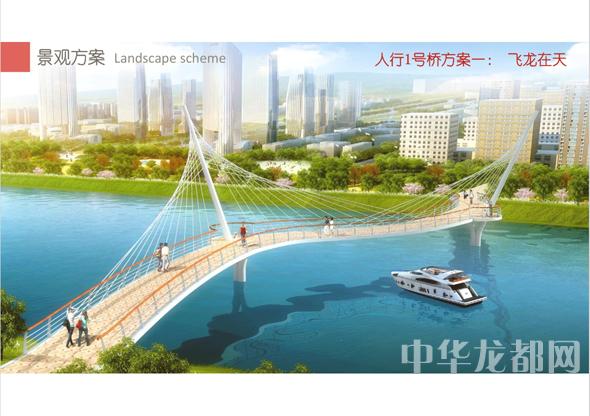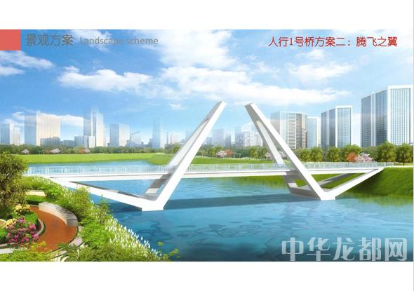 人行1號(hào)橋的設(shè)計(jì)方案有兩套,分別為“飛龍?jiān)谔臁焙汀膀v飛之翼”?!帮w龍?jiān)谔臁睘殡p塔斜拉橋。記者從效果圖中看到,該橋呈現(xiàn)出優(yōu)美的線條,宛如一條長龍騰空在天。“騰飛之翼”為V腿連續(xù)鋼箱梁橋。記者從效果圖中看到,橋體簡潔流暢,時(shí)尚現(xiàn)代,橋墩形成穩(wěn)固的三角形,像兩只燕子展翅高飛。