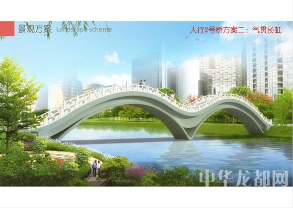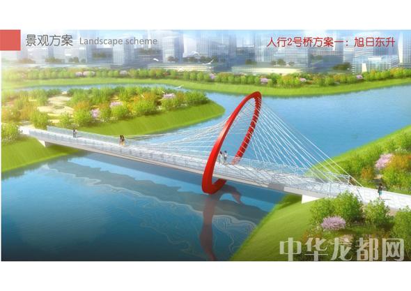 人行2號(hào)橋的設(shè)計(jì)方案有兩套,分別為“旭日東升”和“氣貫長虹”。“旭日東升”為圓形塔懸索橋。記者從效果圖中看到,該橋的橋塔為圓形,猶如一輪東升的太陽,象征著城鄉(xiāng)一體化示范區(qū)蓬勃發(fā)展的未來。“氣貫長虹”為中承式系桿拱橋。該方案結(jié)合中國玉帶橋的古典元素、抽象古典幾何美學(xué),采用現(xiàn)代的設(shè)計(jì)手法,創(chuàng)作出現(xiàn)代感和中國傳統(tǒng)橋梁元素雜糅的橋梁設(shè)計(jì)。