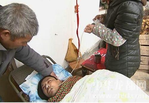 為給兒子治病,3年來(lái),家人花光了所有積蓄,借遍了所有親朋好友。由于無(wú)錢(qián)治療,張德印只好把兒子從醫(yī)院拉回家里照顧。和老伴兩個(gè)人護(hù)理他,為了給兒子張肖喂水,只有用針管進(jìn)行鼻飼,拉屎拉尿帶著尿布、下著尿,每天幾次換洗。