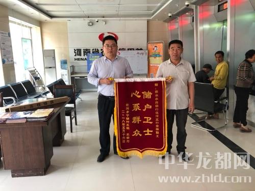 中華龍都網(wǎng)訊(周口報業(yè)全媒體記者 付永奇 通訊員 高少輝)5月24日上午,商水縣化河鄉(xiāng)村民史學(xué)習(xí)和村支書一同來到商水農(nóng)商銀行化河支行,為該支行送來一面“儲戶衛(wèi)士 心系群眾”的榮譽錦旗,感謝該支行幫其找到丟失的現(xiàn)金。
