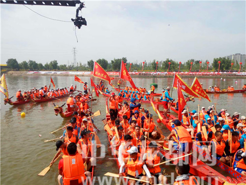 精彩無比的翎船捕鴨賽后,首先進(jìn)行的是市直組、企業(yè)組200米競速賽的預(yù)選賽。隨著發(fā)令槍響,各參賽隊伍迅速搖動船槳,爭先恐后地向前劃行。在兩岸觀眾一浪高過一浪的吶喊助威聲中,參賽隊頑強(qiáng)拼搏,競相沙潁河上飛渡,不僅點燃了市民傳承龍舟文化的熱情,也點燃了周口人民的競進(jìn)激情。