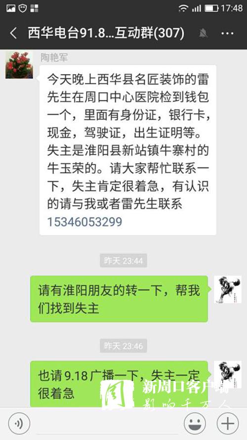 很快,一條尋找失主的愛心信息,便通過無線網(wǎng)絡(luò),乘著夜色翅膀,在豫東大地的西華縣政協(xié)群、西華縣非公黨工委群、西華縣城市管理群、西華縣愛心粥屋群、西華電臺91.8互動群、周口市個私協(xié)會系統(tǒng)群、淮陽縣非公黨工委群、淮陽縣文明辦群、淮陽縣城市管理群等微信群迅速散發(fā)開來。很多群友進(jìn)行轉(zhuǎn)發(fā)、點(diǎn)贊。