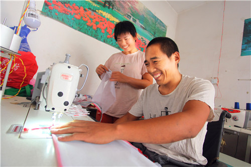 生意閑的時候,朱建舟又和妻子商量,借錢購買了兩臺縫紉機,幫助附近一家工廠加工環(huán)保袋。加工活雖然不累,但對于雙腿殘疾的朱建舟來說卻很困難。一向愛動腦筋的朱建舟自己動手把縫紉機踏板改裝成手動式的,大大提高了工作效率?!耙粋€月能掙2000多元錢,還能顧家,照顧病人和孩子。”王五妮心里有說不出的高興。