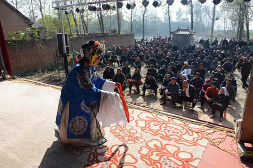 11月3日上午,記者在平店鄉(xiāng)吳吉屯村看到,剛剛落成的村室門前搭建了一個大舞臺,洛陽市的一家豫劇團正在表演精彩的古裝戲曲,舞臺前坐滿了村民(如圖)。