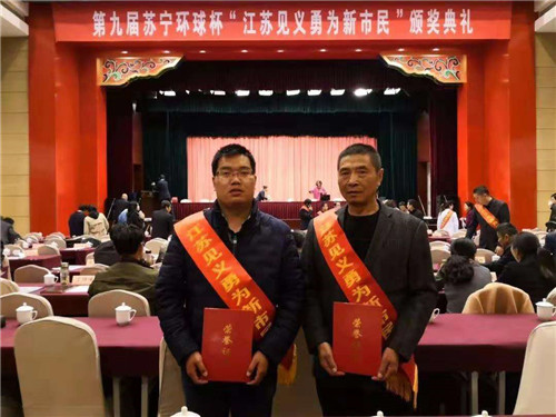 11月14日,江蘇省見義勇為基金會第九屆蘇寧環(huán)球杯“江蘇見義勇為新市民”頒獎典禮在南京舉行,來自河南省項城市新橋鎮(zhèn)的農(nóng)民工曹書志獲此殊榮。