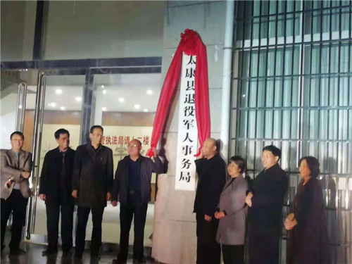 11月27日,太康縣退役軍人事務(wù)局掛牌成立??h委常委、常務(wù)副縣長張保華,縣委常委、副縣長韓維俊,縣政協(xié)副主席、縣民政局局長劉鳳芹出席揭牌儀式??h編辦主任毛雙龍、縣退役軍人事務(wù)局干部職工參加揭牌儀式。