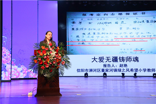 報(bào)告會(huì)上,李芳的同事綠之風(fēng)希望小學(xué)教師趙艷、李芳的老師信陽(yáng)職業(yè)技術(shù)學(xué)院語(yǔ)言傳媒學(xué)院教師熊可書(shū)、李芳的女兒代雨辰和信陽(yáng)市浉河區(qū)委宣傳部新聞中心記者劉亞迪分別以《大愛(ài)無(wú)疆鑄師魂》,《那是青春吐芳華》,《有媽媽的地方處處是溫暖》,《大別山上映山紅》為題,深情講述李芳同志一心想著學(xué)生,全身心投入教育工作,扎根鄉(xiāng)村獻(xiàn)身教育事業(yè)的點(diǎn)點(diǎn)滴滴,詮釋了李芳同志不忘初心、潛心育人、敬業(yè)奉獻(xiàn)、舍生忘我的高尚品德和優(yōu)秀品質(zhì),為與會(huì)者帶來(lái)了一場(chǎng)感人肺腑的報(bào)告會(huì)。