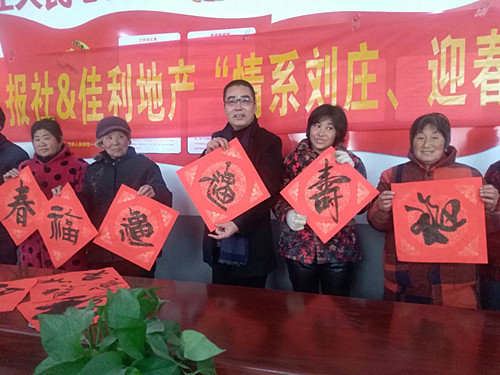 1月25日,周口報業(yè)傳媒集團(tuán)偕愛心企業(yè)佳利偉業(yè)、周口農(nóng)商銀行,邀請周口藉中國書協(xié)會員靳玉峰、曾祥峰等,來到淮陽馮塘劉莊村,為群眾義寫、贈送春聯(lián)500多套,村委大院一片歡騰,喜氣洋洋。