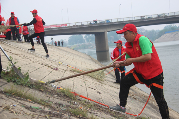 志愿者清理堤坡垃圾