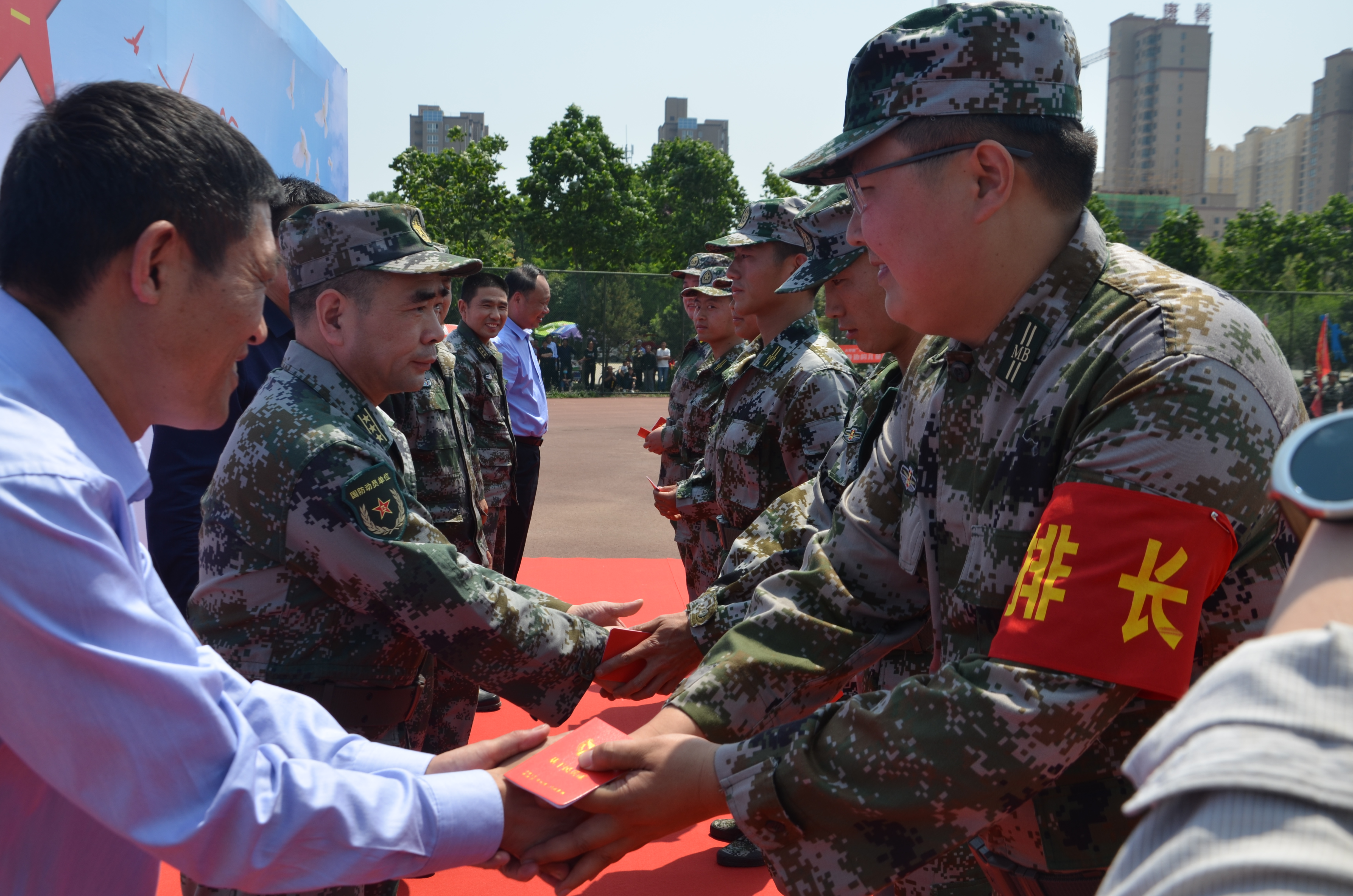 大會在雄壯的《解放軍軍歌》中拉開了序幕??h委常委、人武部政委曹新旺宣布基干民兵排以上干部任職命令,縣委常委、常務(wù)副縣長郝四春代表縣委、縣政府、縣人武部為基干民兵分隊授旗,綜合應(yīng)急連指導(dǎo)員、縣人武部政工科長李紅藝帶領(lǐng)全體民兵面對國旗宣讀民兵誓詞。在場領(lǐng)導(dǎo)向民兵代表發(fā)放了基干民兵證和入隊通知書,民兵代表和教練員代表分別進行了表態(tài)發(fā)言。