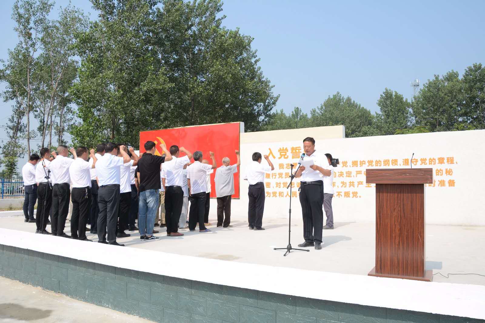 “我志愿加入中國(guó)共產(chǎn)黨,擁護(hù)黨的綱領(lǐng),遵守黨的章程……”升國(guó)旗儀式結(jié)束后,由紀(jì)莊支部書記李國(guó)喜領(lǐng)誓,全體黨員面對(duì)鮮紅黨旗,胸前佩戴黨徽,排著整齊的隊(duì)列,高高舉起右手,再次向黨作出了莊嚴(yán)地承諾,重溫入黨誓言,聲聲入耳,句句入心。