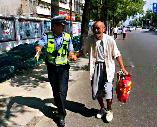 畢鵬發(fā)現(xiàn)這一情況后,立即上前攙扶老人,路過(guò)的車(chē)輛看到這一幕也紛紛停車(chē)讓行。在安全通過(guò)馬路后,老人告訴畢鵬,他找不到公交車(chē)站,無(wú)法回家。隨后,畢鵬手挽手將老人送到公交車(chē)站(如圖)。待老人安全坐上公交車(chē)后,畢鵬才回到工作崗位上。