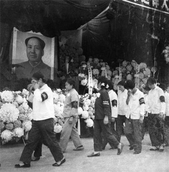 廣播喇叭一直轉(zhuǎn)播著中央人民廣播電臺的節(jié)目,哀樂一遍遍響起,回蕩在大街小巷、城鎮(zhèn)鄉(xiāng)村,大家不約而同地佩戴黑紗,自發(fā)做白花、扎花圈、寫挽聯(lián),商店里的白紙和黑布都賣缺了。機(jī)關(guān)單位的同志在自己布置起來的靈堂里悼念毛主席,學(xué)生每天上課之前都向毛主席默哀,工廠里掛起了“繼承毛主席遺志,抓革命、促生產(chǎn)”的橫幅,農(nóng)民佩戴著黑紗在田野里勞動。