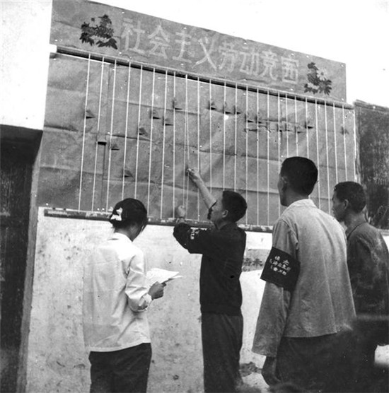 項(xiàng)城工人佩戴黑紗開展社會主義競賽。