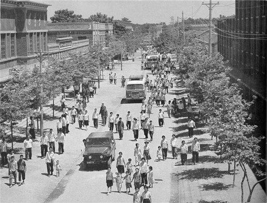 1975年6月,西華縣城唯一的一條硬化路面大街,現(xiàn)在的箕城路。 1975年5月,新華社一名攝影記者來到河南,從鄭州花園口到周口商水、西華、太康、扶溝、淮陽,歷時(shí)一個(gè)半月采訪拍攝黃泛區(qū)現(xiàn)狀。途徑地政府安排當(dāng)?shù)財(cái)z影家與其共同拍攝,周口攝影家葛慶亞、李中華、岳獻(xiàn)甫參與了拍攝。受政治環(huán)境影響,這批圖片推遲到1979年才集結(jié)成冊,由外文出版社分英文、法文、西班牙文三種語言出版。當(dāng)時(shí),外文出版社隸屬出版總署,由中共中央宣傳部領(lǐng)導(dǎo),出版了大量的外宣圖書贈送外國駐華領(lǐng)事館。 (圖片來源:圖書《Former yellow river flood area transformed》中文名《黃泛區(qū)變化》)