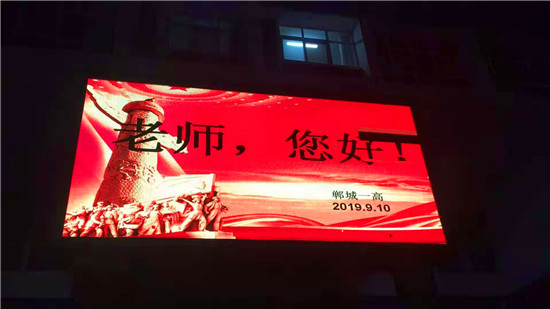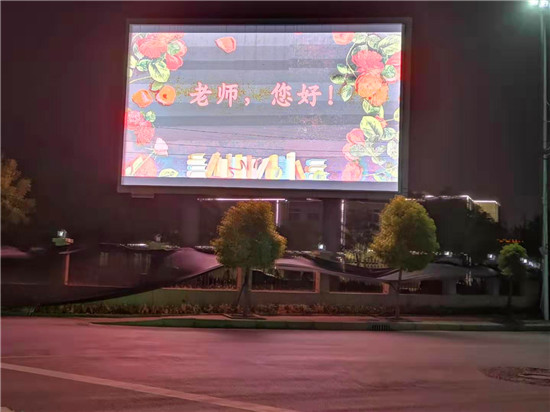 “老師,您好!”9 月10日晚上,鄲城縣人民公園大屏幕上,向全縣教師發(fā)出了溫暖、明亮的祝福。同一時刻,城區(qū)各主要街道公共LED大屏幕,以及縣一高、三實小等城區(qū)學(xué)校和石槽一中、秋渠一中等鄉(xiāng)村學(xué)校的顯示屏上,“老師,您好”四個大字在夜幕下顯得格外的醒目與亮眼。教師節(jié)當(dāng)夜,老師儼然成為了“夜空中最閃亮的星”。
