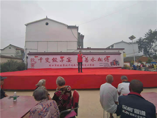 與此同時,在演出現(xiàn)場附近的村委大院內,由周口市慈孝文化促進會、北斗達教育集團等組成的200多名志愿團隊正忙得不亦樂乎,調餡、包餃子、下鍋、端盤,兩個多小時內,他們精心包出20000多個愛心水餃。11時30分,餃子宴正式開始,老人們一邊吃著水餃一邊觀看者演出,喜笑顏開,呈現(xiàn)出一片相親相敬的溫馨畫面。