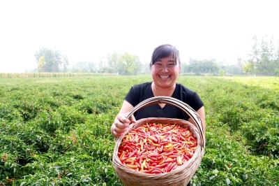 在朱樓行政村,朱高杰、王麗夫妻倆正帶領(lǐng)20多名采摘工人在辣椒田里采摘艷紅、泡椒兩個(gè)品種,地頭停放著盛滿辣椒的三輪車和五六個(gè)蛇皮袋,火紅的辣椒映襯著小兩口臉上燦爛的笑容:“大豐收呀,這塊地是泡椒,還沒(méi)有出地頭,就劃3.8元一斤了,走向市場(chǎng)至少五六元錢(qián)。咱吃的泡椒鳳爪、泡椒罐頭,都是這做的。像那塊地的艷紅,就像它的名字一樣又紅又鮮艷,出地頭就得七八塊,賣到市場(chǎng)上都10多元一斤,主要賣到四川、湖北等地,這是火鍋底料、炒菜的必備品,這是個(gè)炒出來(lái)有香味的辣椒品種?!蓖觖惸苷f(shuō)會(huì)道,而且在她的帶動(dòng)下,全鄉(xiāng)許多親朋好友都在種植辣椒。像王麗一樣,汲水鄉(xiāng)種植辣椒面積突破了1萬(wàn)畝,整個(gè)鄲城縣種植辣椒突破5萬(wàn)畝。