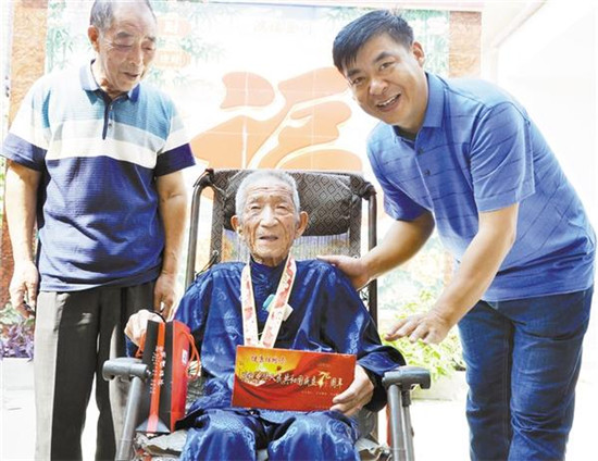9月26日,商水縣退伍軍人事務(wù)局工作人員為譚莊鎮(zhèn)老革命段凌云送上新中國(guó)成立70周年紀(jì)念獎(jiǎng)?wù)?。今?8歲的段凌云15歲入伍,曾跟隨劉鄧大軍挺進(jìn)大別山,參加過(guò)淮海戰(zhàn)役、渡江戰(zhàn)役、解放大西南戰(zhàn)斗,多次榮立戰(zhàn)功。退伍后,他積極投身家鄉(xiāng)建設(shè),從沒(méi)有向組織上提過(guò)要求。