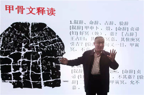 接著,在歷時(shí)兩個(gè)半小時(shí)的分享中,郝教授以融合發(fā)現(xiàn)、甲骨文字拆分、甲骨文書(shū)風(fēng)及甲骨文書(shū)法創(chuàng)作為立足點(diǎn),襯以個(gè)人習(xí)書(shū)作品,從文化本義的內(nèi)涵、文化本義的要素、文化的生成和甲骨文的演化和發(fā)展等方面詳細(xì)闡述了文化的來(lái)源以及人類社會(huì)進(jìn)步的過(guò)程。