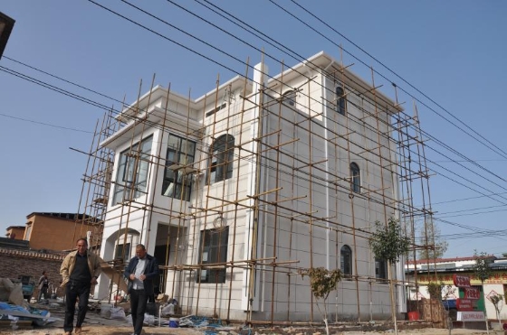 11月20日,在全國文明村——商水縣巴村鎮(zhèn)上城村,村民朱云山家的3層輕鋼別墅正在建造中。這是該村第一幢新式別墅,全框架結(jié)構(gòu),造型別致,沒有使用砂石、水泥、磚瓦等,全部使用新型環(huán)保建材,建造過程就像搭積木一樣,并具有節(jié)能環(huán)保、防風(fēng)抗震、隔音防火、造價低廉、建造快等特點(diǎn),很受喜歡。圖為附近村民前來參觀。記者 付永奇 攝