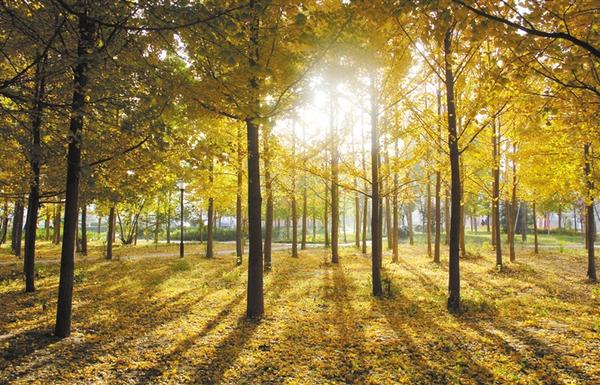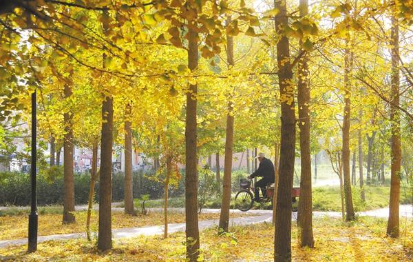 近日,周口市經(jīng)濟(jì)開發(fā)區(qū)人民廣場(chǎng),金黃色的楊樹葉在陽光照耀下熠熠生輝,給城市增添一抹亮色。張振海 攝