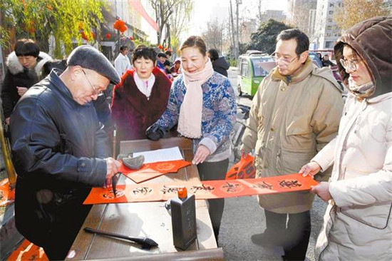 1月19日,由周口市民間文藝家協(xié)會(huì)、川匯區(qū)文聯(lián)聯(lián)合舉辦的“送萬(wàn)福進(jìn)萬(wàn)家”義寫(xiě)春聯(lián)活動(dòng),在周口華威民俗文化博物苑門(mén)前舉行。來(lái)自市書(shū)協(xié)、川匯區(qū)書(shū)協(xié)的20多名書(shū)法家現(xiàn)場(chǎng)揮毫潑墨,義寫(xiě)春聯(lián)和“?!弊?,受到市民的一致好評(píng)。記者 梁照曾 攝