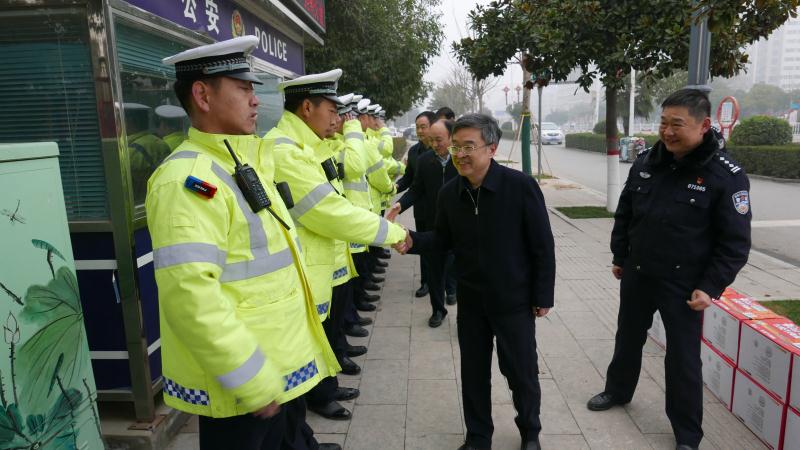 慰問中,皇甫立新、劉國(guó)慶一行首先來(lái)到縣交警大隊(duì)城區(qū)中隊(duì)五岔路口執(zhí)勤點(diǎn),同正在執(zhí)勤的交通民警一一握手,并代表縣委、縣政府向交警大隊(duì)全體民警、協(xié)警一年來(lái)付出的努力和辛苦表示感謝和問候,囑咐他們要注意安全,保重身體。在詳細(xì)了解了春節(jié)期間治堵保暢工作情況匯報(bào)后,皇甫立新對(duì)交警大隊(duì)全體民警和輔警在春節(jié)期間放棄和家人團(tuán)聚,舍小家顧大家,堅(jiān)守在道路交通安全管理崗位的工作態(tài)度,以及主動(dòng)作為,敢于擔(dān)當(dāng),無(wú)私奉獻(xiàn)、任勞任怨的工作作風(fēng)給予高度肯定。并希望大家在春節(jié)期間,繼續(xù)發(fā)揚(yáng)吃苦耐勞的精神,全力做好道路安全保障工作,確保春節(jié)期間全縣道路交通安全暢通,讓全縣人民度過(guò)一個(gè)平安、祥和的春節(jié)。同時(shí),縣交警大隊(duì)要進(jìn)一步做好執(zhí)勤民警后勤保障及防寒保暖工作,加強(qiáng)人員輪換上崗,切實(shí)保障公安交警切身利益,解決他們的后顧之憂。