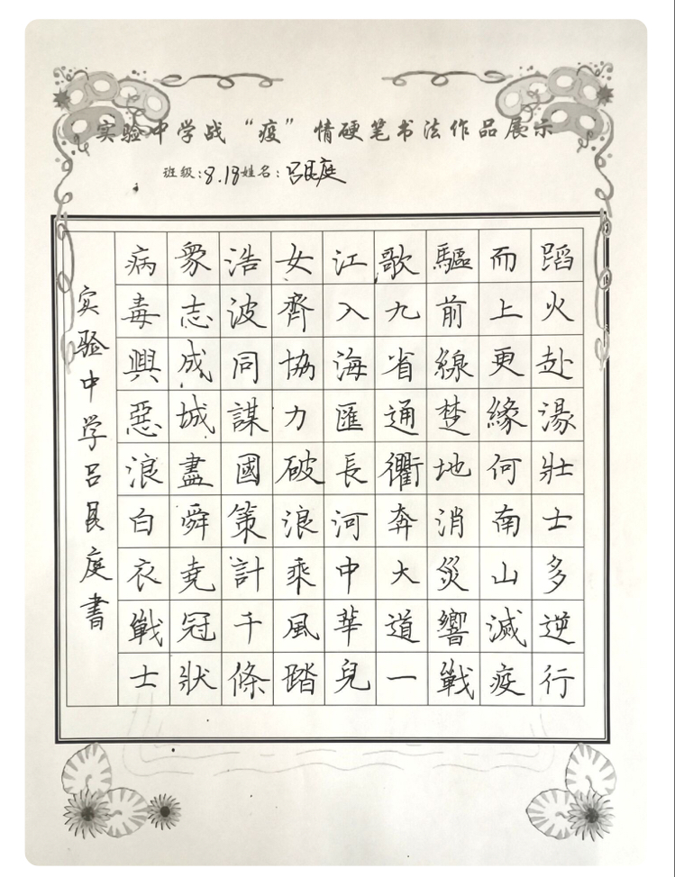 “赴湯蹈火壯士多,逆行而上更緣何。南山滅疫驅(qū)前線,楚地消災(zāi)響戰(zhàn)歌。九省通衢奔大道,一江入海匯長河。中華兒女齊協(xié)力,破浪乘風(fēng)踏浩波......”扶溝縣實驗中學(xué)“萬眾一心 抗擊新冠”硬筆書法比賽中,八(18)班呂艮庭同學(xué)鄭重地抄錄了這首律詩。