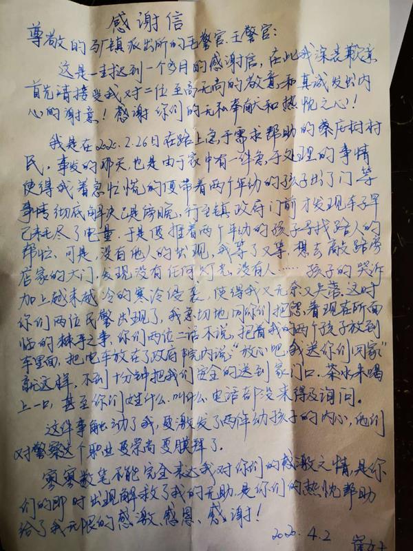 為向民警致謝,崔女士家人多次聯(lián)系馬廠派出所所長(zhǎng)毛衛(wèi)庚說要表示感謝,都被婉言謝絕了。近日,已身在鄭州打工的崔女士每次想到那晚民警們對(duì)她們的幫助都心存感激,于是她就手寫了一封感謝信,并制作了一面錦旗,從鄭州郵寄到家里,讓親戚幫忙送到馬廠派出所以示感謝。
