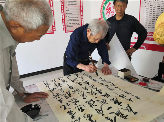 曾慶祥、李宏亮、閆子明、朱好明、單建勛、劉祖祥等9名老年書畫名家一下車,顧不上休息,就紛紛潑墨揮毫,現(xiàn)場(chǎng)為群眾義寫義畫486幅,為村民們獻(xiàn)上一場(chǎng)難得一遇的文化盛宴。雖然天氣炎熱,但是書畫家不辭辛苦,就連已經(jīng)89歲的李宏亮老師中間也不曾休息片刻,直到中午12:30才收筆,熱火朝天的工作激情贏得了干部群眾的一致好評(píng),也都豎起大拇指為他們點(diǎn)贊!