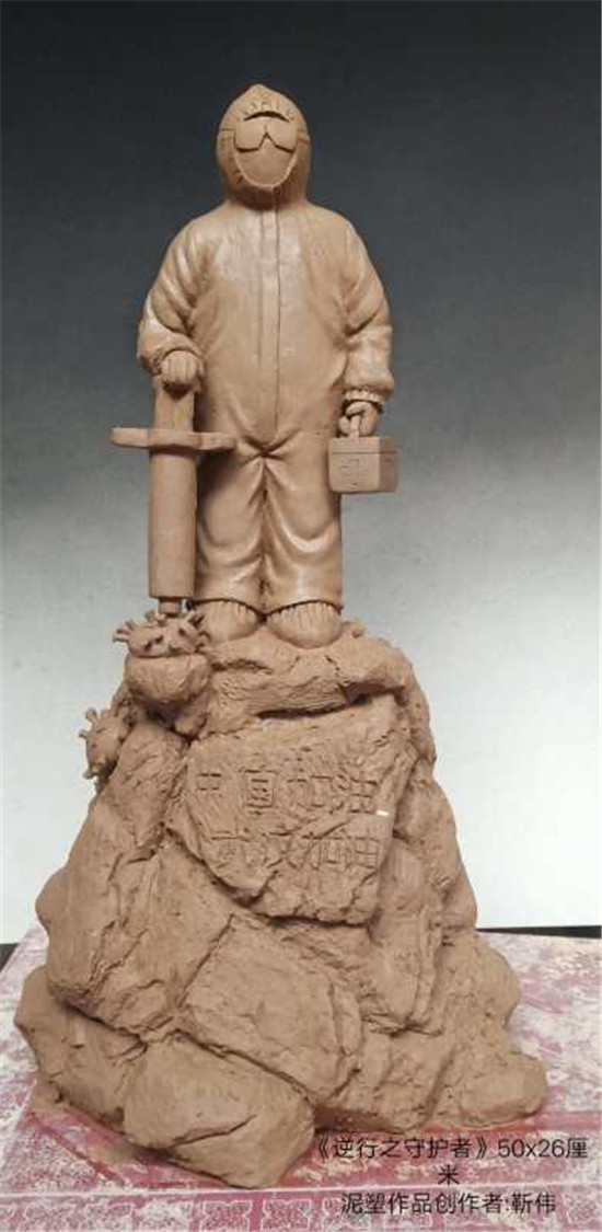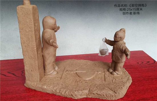 所捐《逆行之守護(hù)者》泥塑作品,高50厘米,寬26厘米,描述全副武裝的醫(yī)護(hù)工作者一手握針管殺死病毒,一手提藥箱救人,謳歌了疫情中逆行的醫(yī)護(hù)工作者不畏犧牲、與新冠病毒搏斗,冒死救治病毒感染者的偉大精神?!陡艨論肀А肥侵v述我市扶溝縣人民醫(yī)院抗疫故事,疫情期間奮戰(zhàn)在抗疫一線的劉海燕醫(yī)生和為自己送年夜飯的女孩隔空擁抱的感人場景,讓無數(shù)人熱淚盈眶。