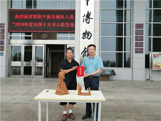 6月12日,在2020年“文化和自然遺產(chǎn)日”即將來臨之際,淮陽區(qū)市級非物質(zhì)文化傳承人靳偉向市博物館捐贈“抗疫”泥塑作品《逆行之守護(hù)者》《隔空擁抱》,以表達(dá)藝術(shù)家對新冠肺炎疫情期間全國醫(yī)務(wù)人員無私精神的敬意。周建山館長向靳偉頒發(fā)榮譽(yù)證書。