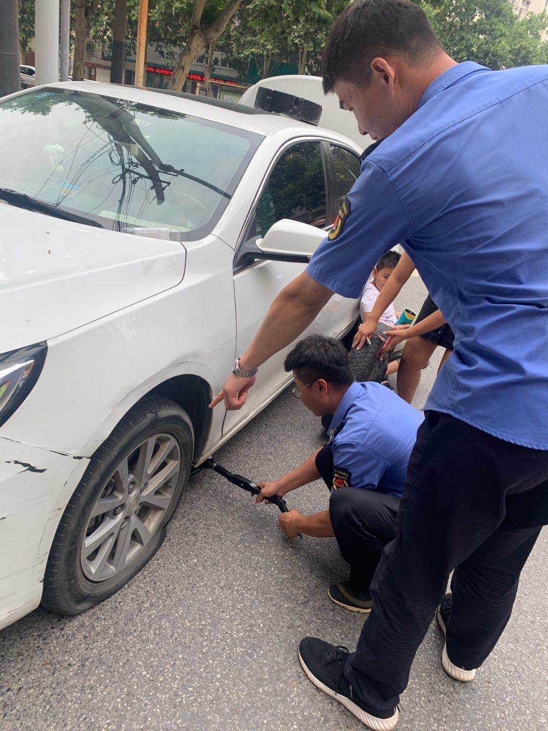 當(dāng)時,城管隊員上前查看發(fā)現(xiàn),車輛左前輪爆胎,一位女車主正在車邊焦急地徘徊,車內(nèi)還有一兒童,因天氣炎熱,焦躁不安。